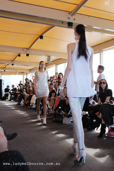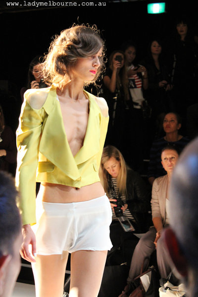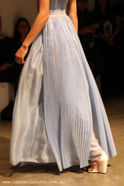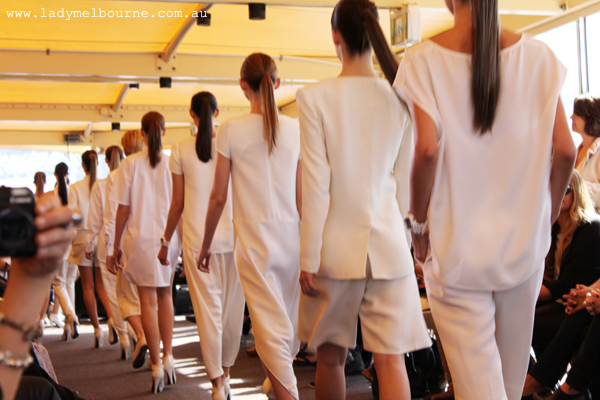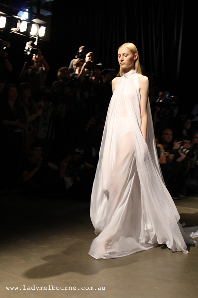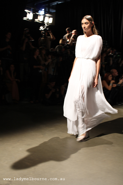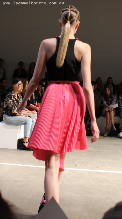 Two things stood out for me at the parades on Day 3 of RAFW yesterday: white and fluro. I was particularly taken with Magdalena Velevska’s take on razor sharp pleats and folds in an array of fluro pinks, oranges, white and black. It was strong, bold and impressive, not to mention wearable.