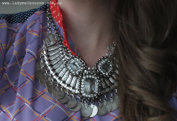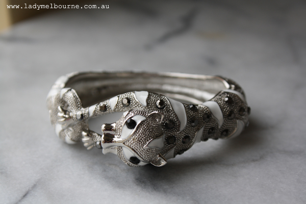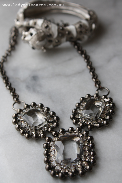 I digress I was walking to Flinders St station the other day and spotted this relatively new shop. I popped in(it is my job after all to tell you about new places to shop in Melbourne!) and picked up this diamonte necklace for about $19(they have 10% off selected necklaces at the moment) and this tiger bracelet. I can’t remember how much it was, under $20 from memory. I’m wearing it with my Turkish necklace because as I told one of my students the other day, why wear one statement necklace when you can wear two?