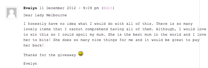 Congratulation Evelyn. Your mum sounds like a really lovely person. Enjoy your Christmas and thank you Lady Melbourne for your awsome and inspiring blog through out the year. Merry Christmas and a happy and safe new year.