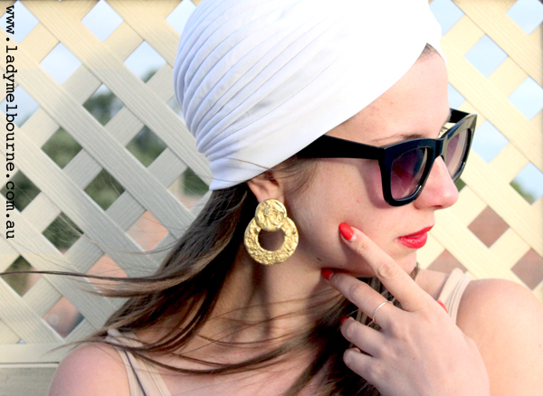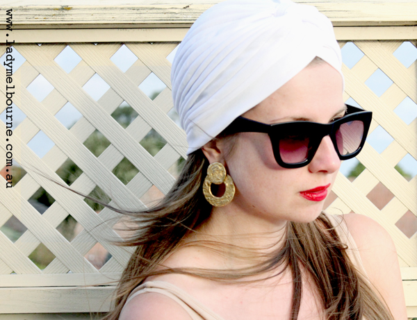 The turban really suit you. Goes nice with the earring. I bought a black turban last year to go with a 1940s dress but didn’t have the confidence to wear it in the end. But now I’ve seen you wear it with great earring and nice sunnies I just might give it a chance.